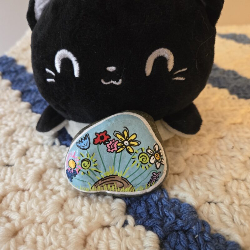My attempt (a bit poorly) at some wildflowers – I don’t do realism! Regardless I love the vibe and the colors. It’s raining here in the Fraser Valley so will hide it on a walk later and maybe bring a little sunshine to someone. Happy Finding!