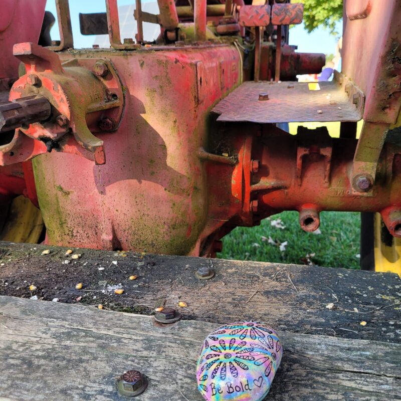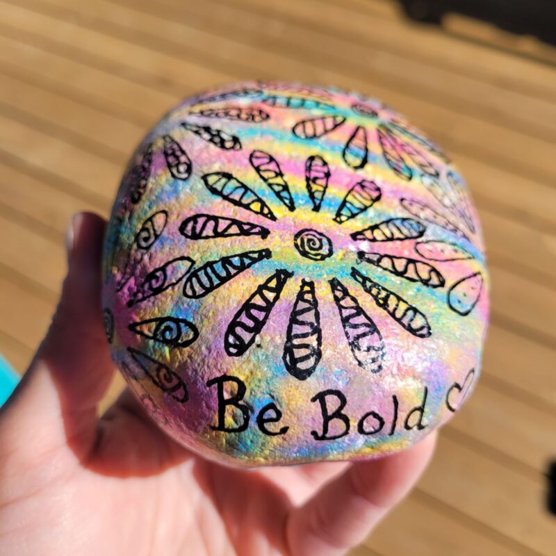 Sponge style background with flower outlines and swirls. Be bold is written on the side. Hidden at Shuh Orchards in Elmira.