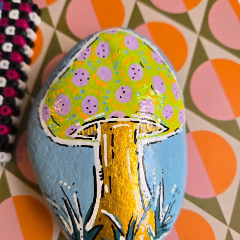 I love painting Mushrooms! Hid outside our fave indian restaurant! To whoever finds it, I hope it makes you smile. It was a blast doing – please feel free to hide it again (just visit the site again, and click Found a Rock?) or take!