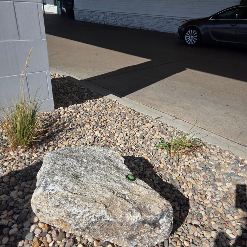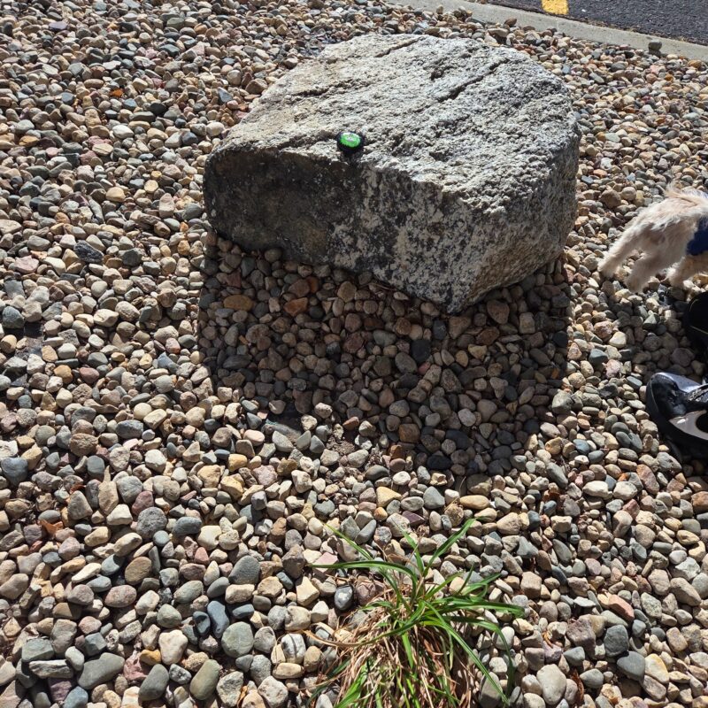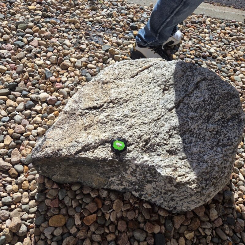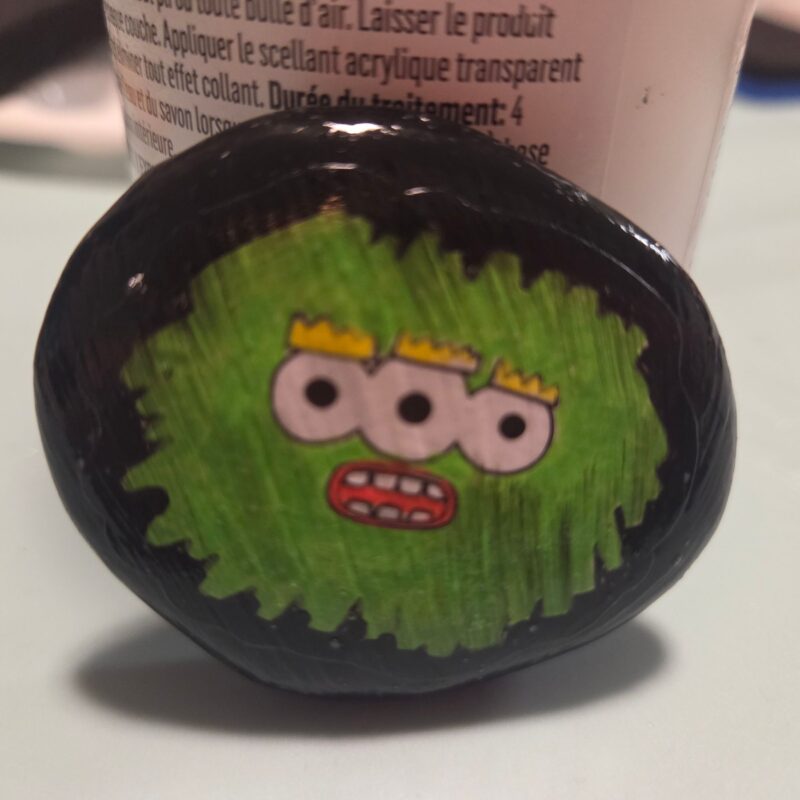 Green fuzzy monster rock with three eyes, looking for a new home. Doesn’t bite hard.