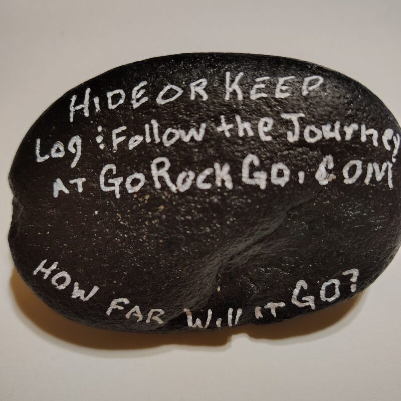 Blending with brushes instead of sponges. 3.5″ w x 2.5″ h rock. Larger size allowed Log and Follow on back as well as How Far will it go? I hope it has a long and eventful journey.