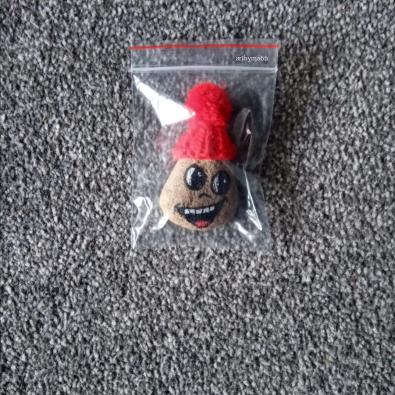 Small pebble with a smiley face wearing a red wooly hat with a pom pom. Carry it in your pocket and you’ve always got a friend close by.