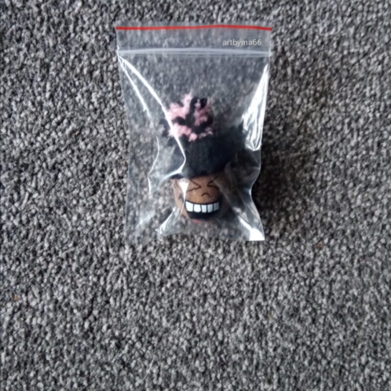 Small pebble with a smiley face wearing a black wooly hat with a pom pom. Carry it in your pocket and you’ve always got a friend close by.
