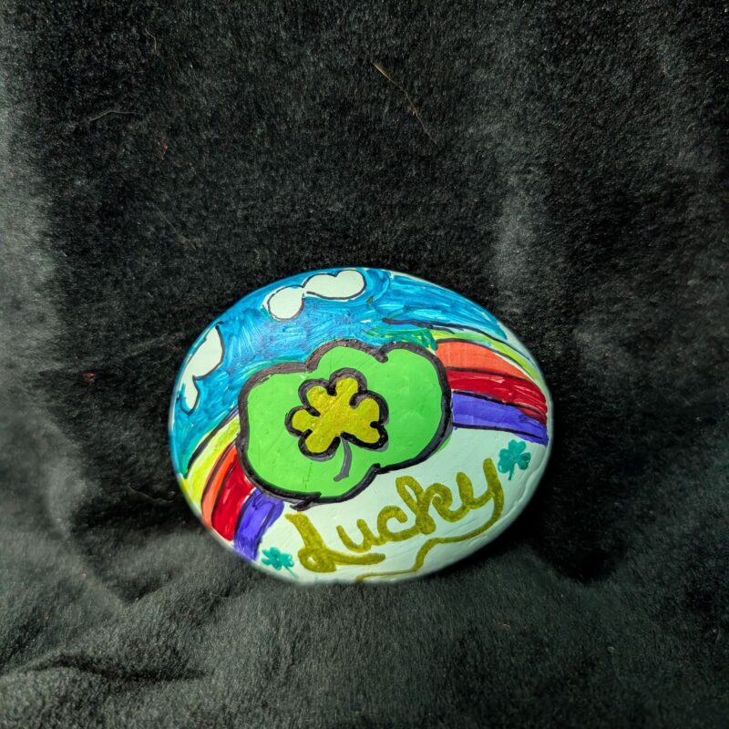 A lucky green rock with a shamrock in front of a rainbow!