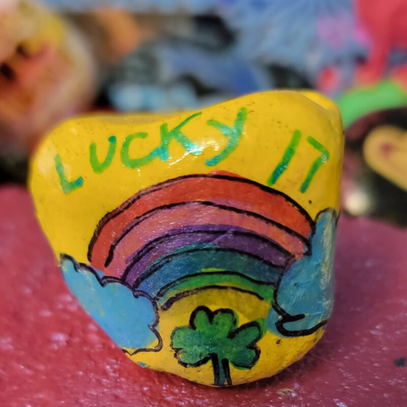 A bright rock featuring a vivid rainbow and 2 clouds over a shamrock.