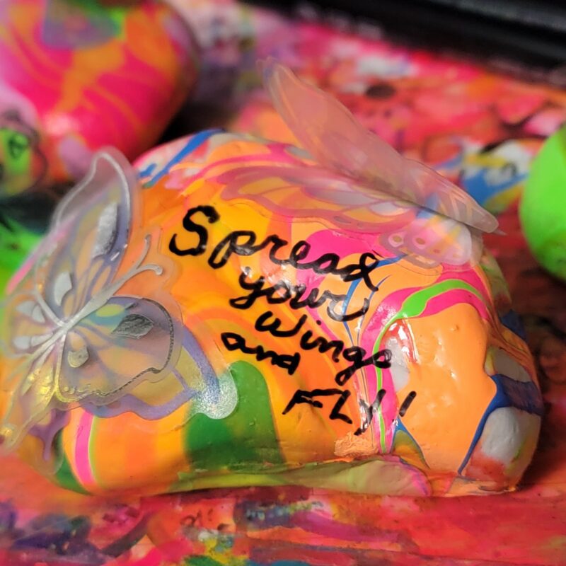 A colorful rock proclaims