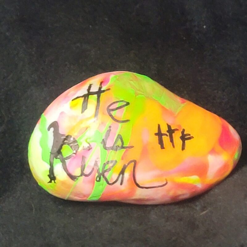 A colorful rock proclaims: